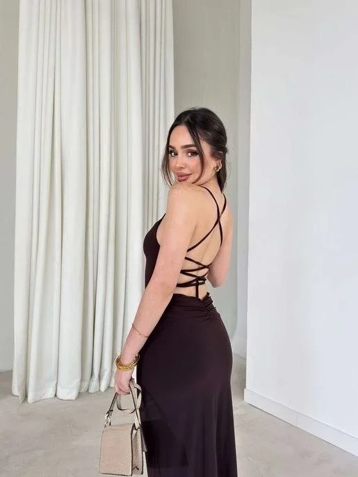 İp Askılı Sırt Dekolteli Bağlama Detaylı Yırtmaçlı Midi Elbise – Kahverengi