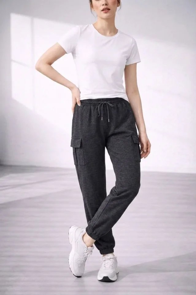 Jogger Eşofman Altı Rahat Kalıp, Kargo Cepli, Lastikli Paça, Günlük Spor Pantolon – Füme