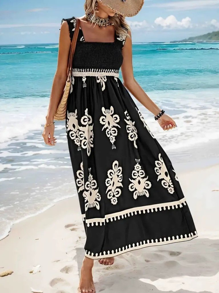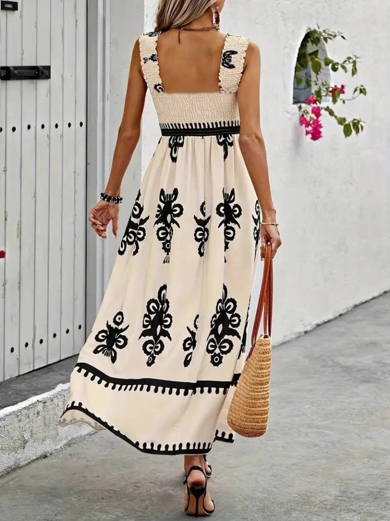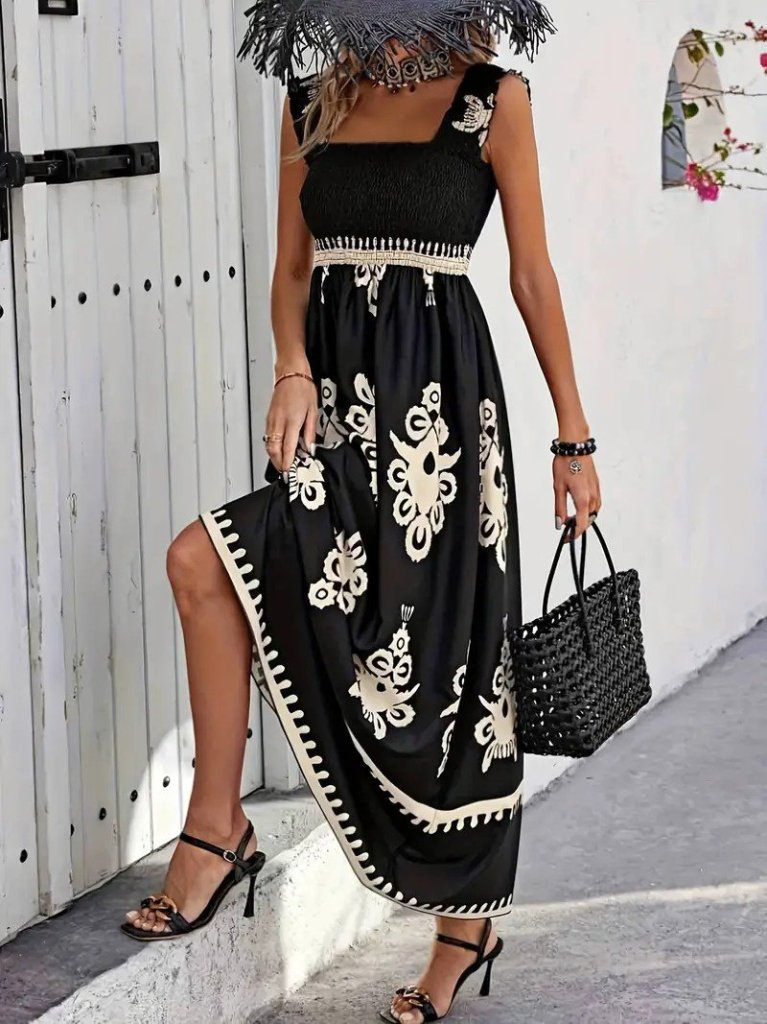 Kadın Askılı Kare Yaka Gipe Detaylı Desenli Suprem Elbise