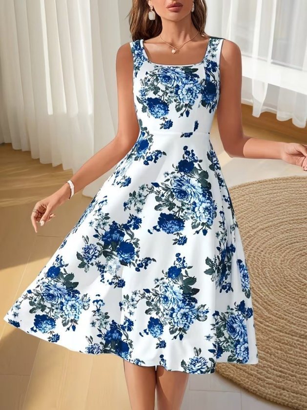 Kadın Askılı Kare Yakalı çiçek Desenli Midi Dalgıç Elbise