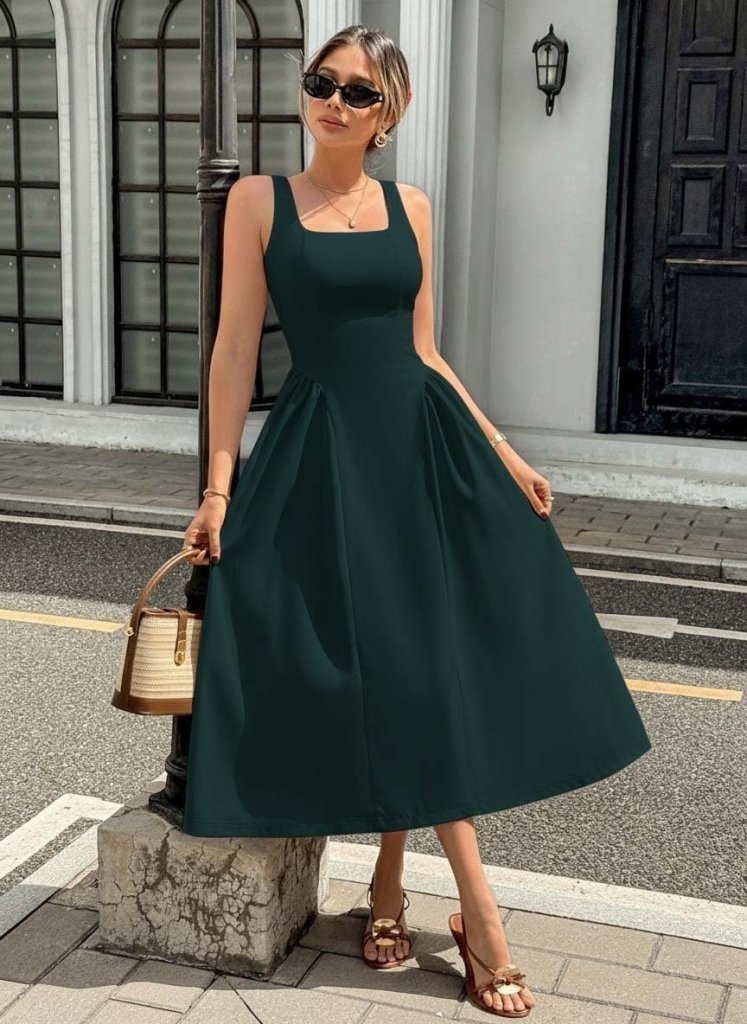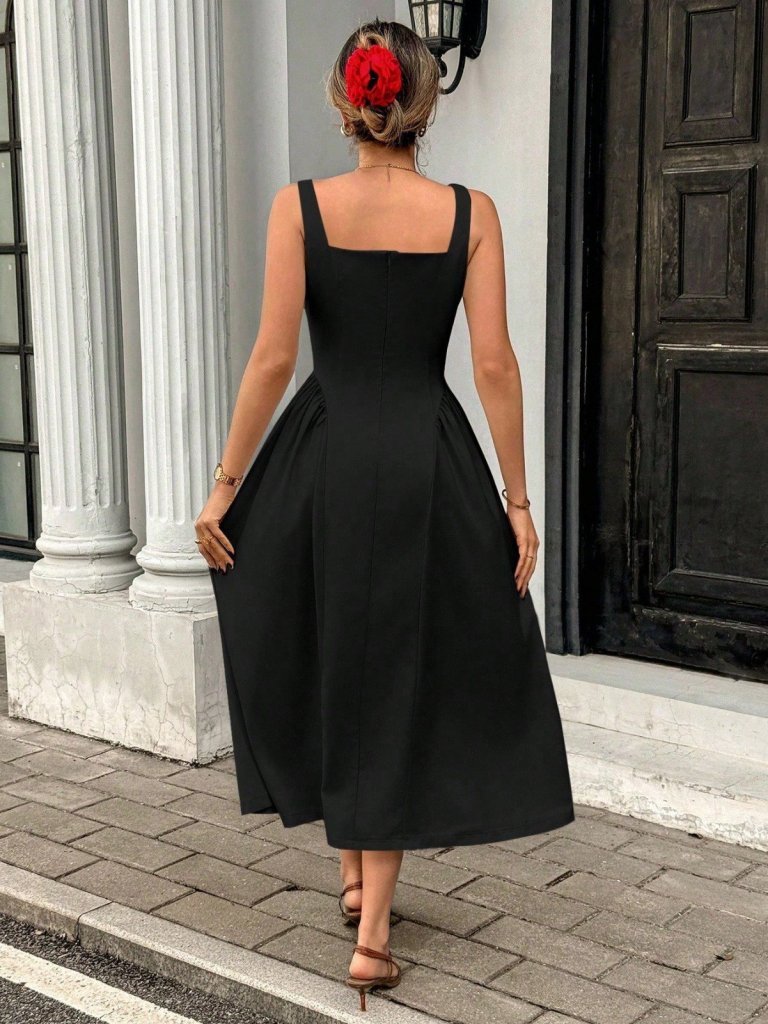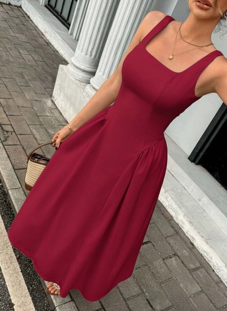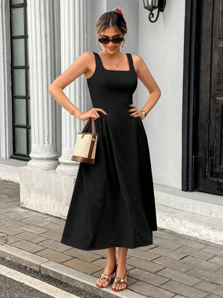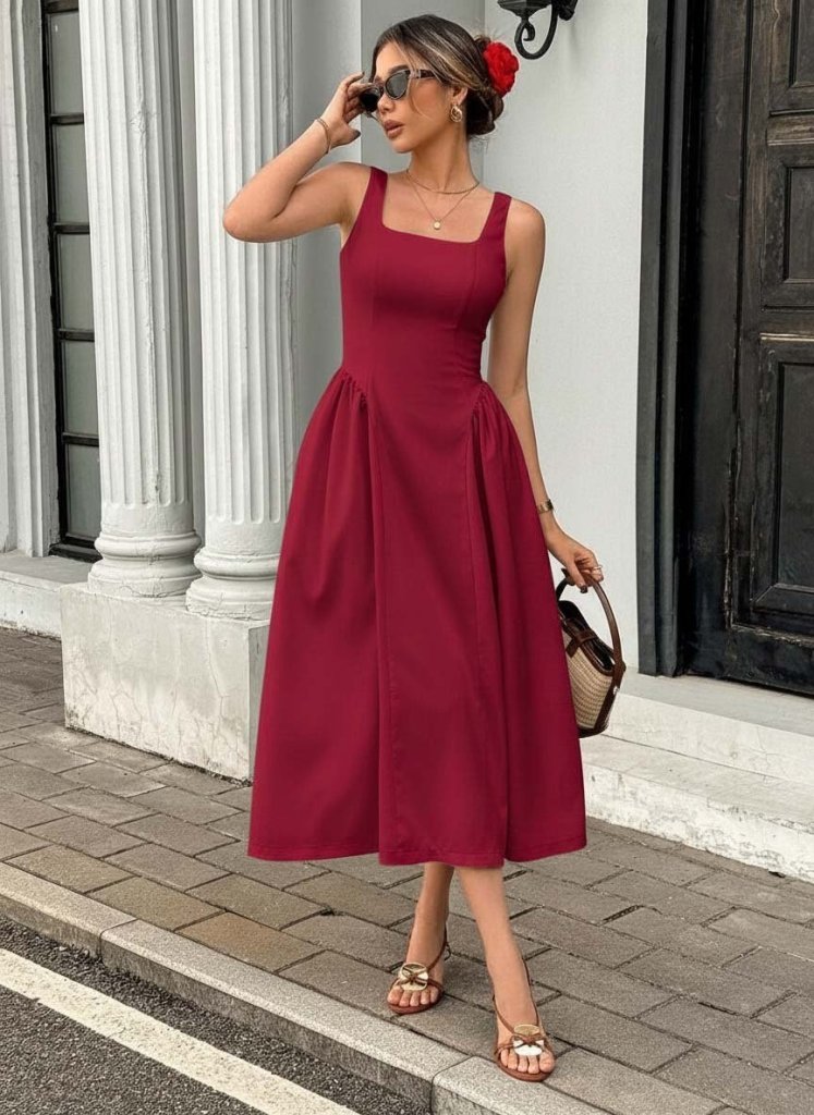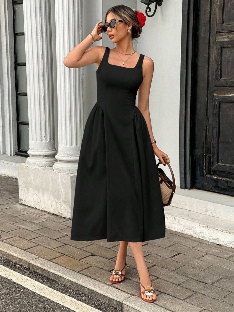 Kadın Askılı Kare Yakalı Uzun Ithal Krep Elbise
