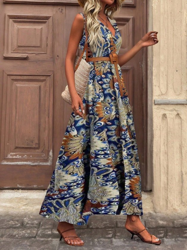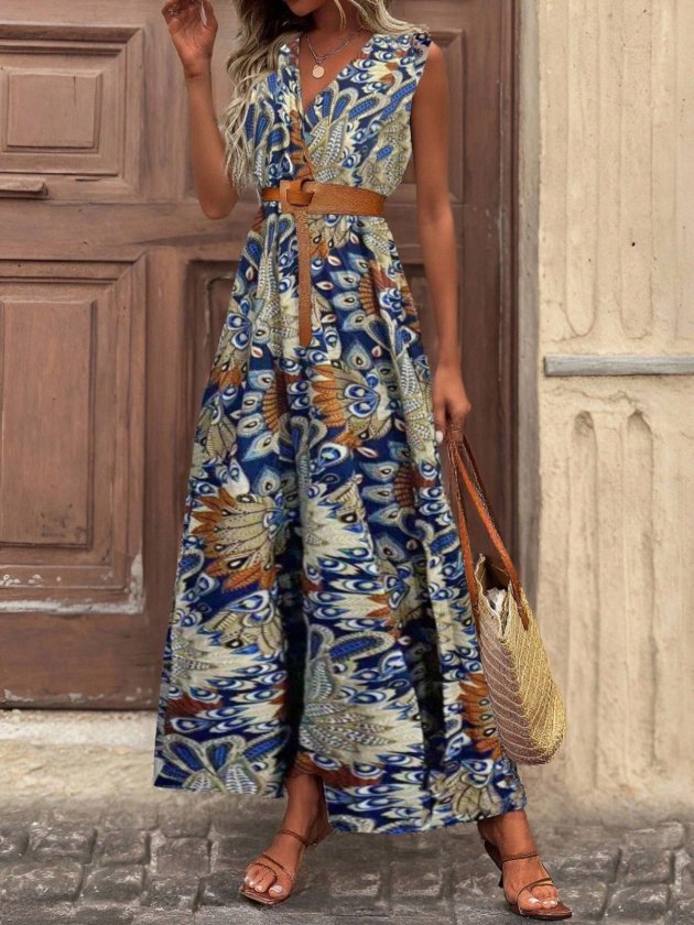 Kadın Kolsuz Boyundan Askılı Desenli Midi Süprem Elbise