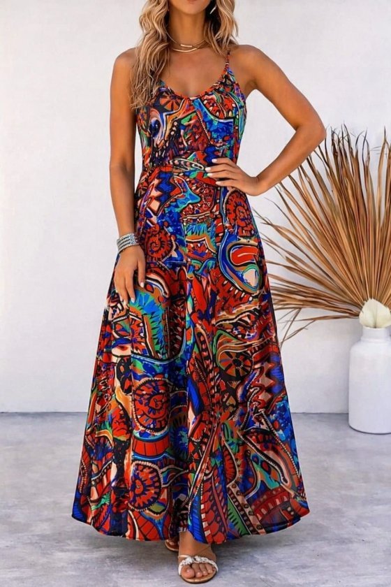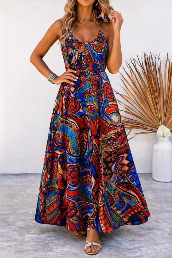 Kadın Askılı V Yakalı Desenli Uzun Süprem Elbise