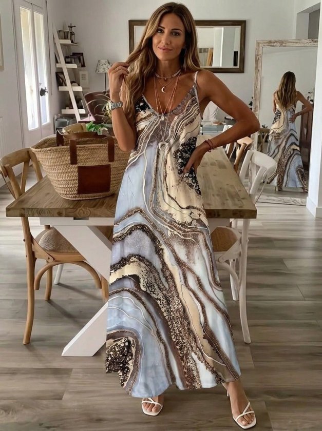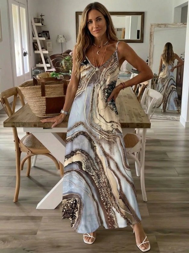 Kadın Askılı V Yakalı Desenlı Uzun Süprem Elbise