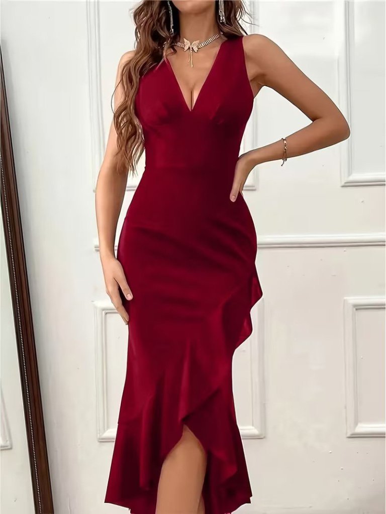 Kadın Dalgıç Kumaş V Yaka Yırtmaç Detaylı Maxi Boy Elbise