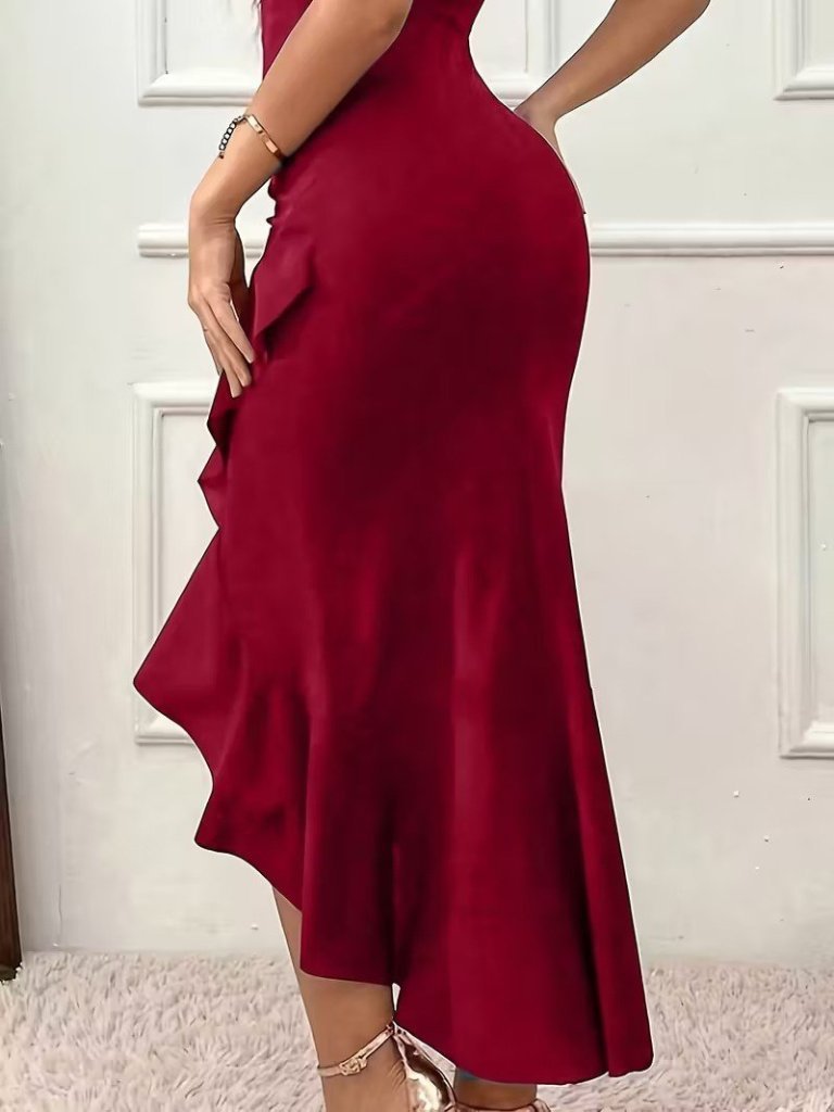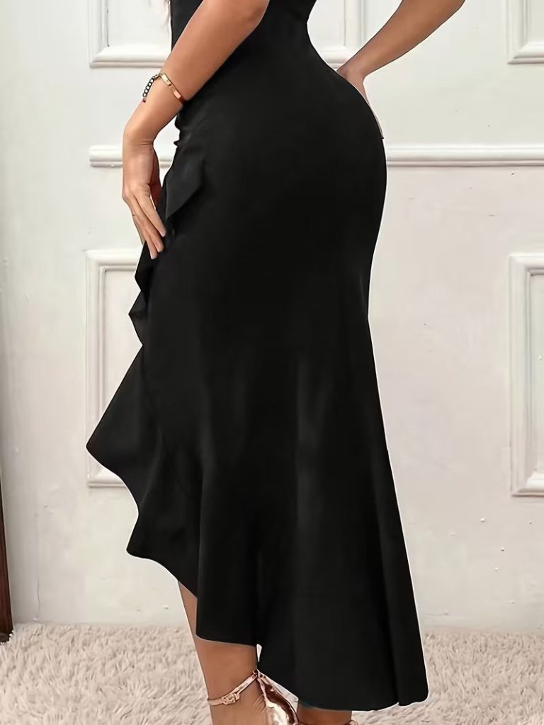 Kadın Askılı V Yakalı önden Fırfırlı Uzun Ithal Krep Elbise