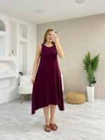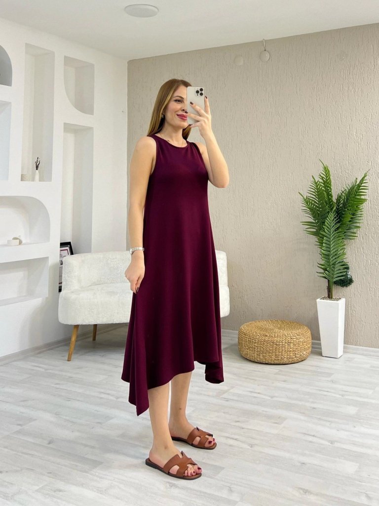 Kadın Askılı Yuvarlak Yakalı Asimetrik Kesim Detaylı Viskon Elbise