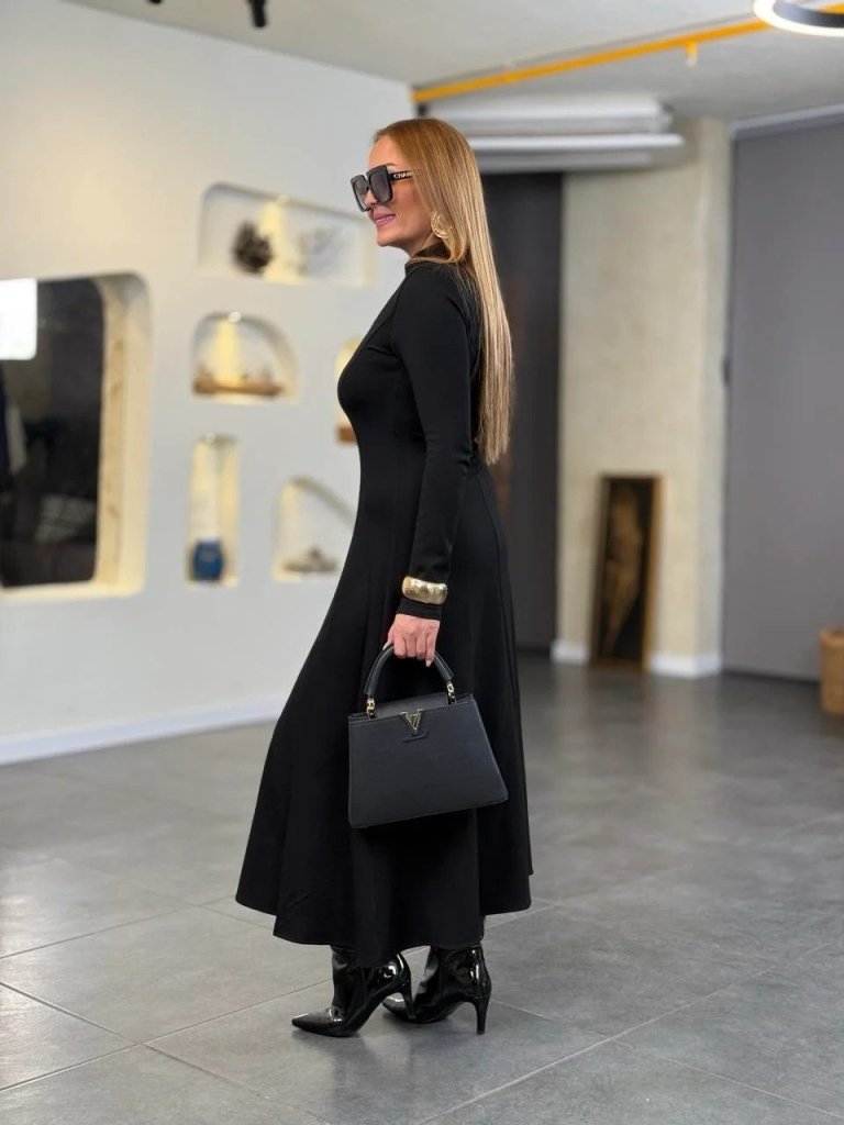 Kadın Balıkçı Yaka Damla Detaylı Yırtmaçlı Uzun Viskon Iki Iplik Maxi Elbise