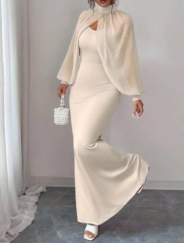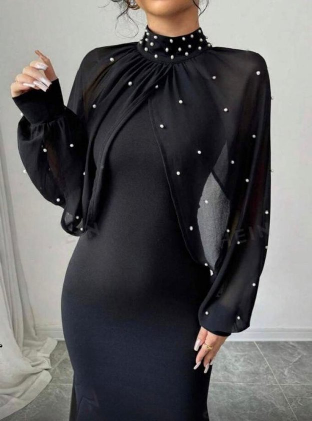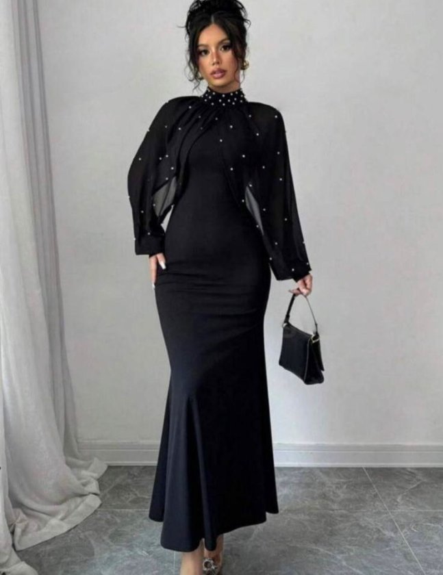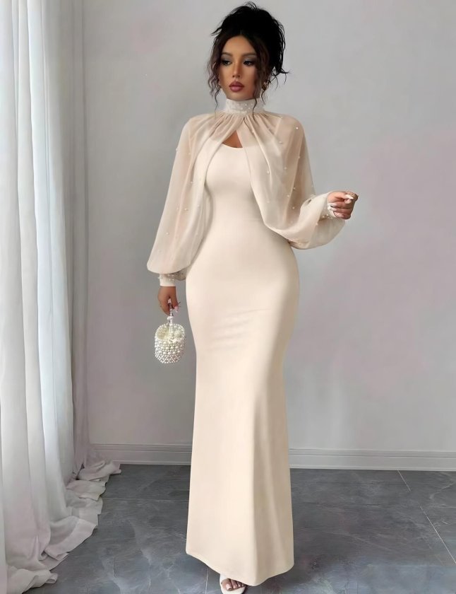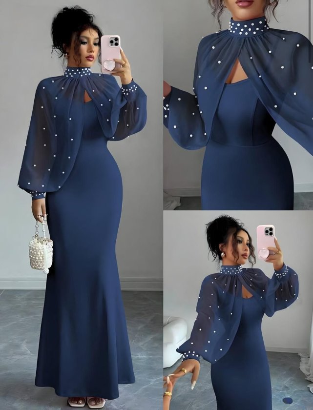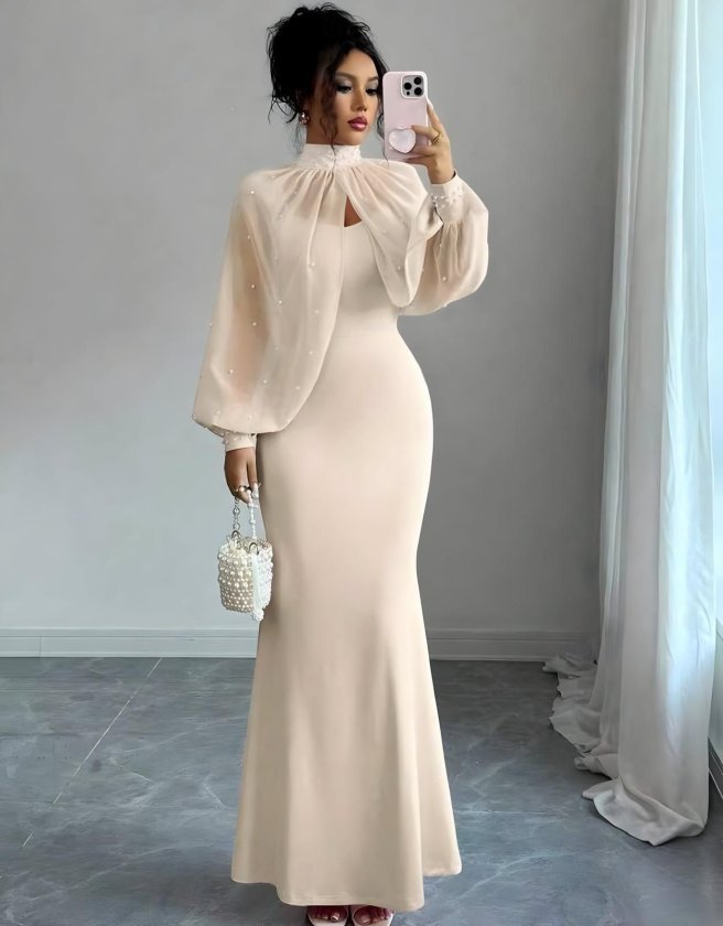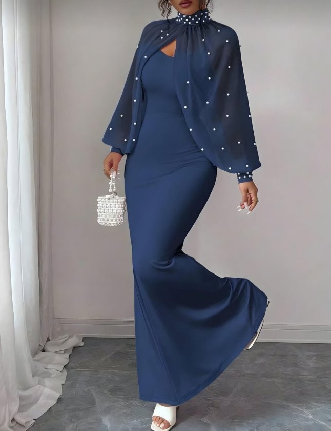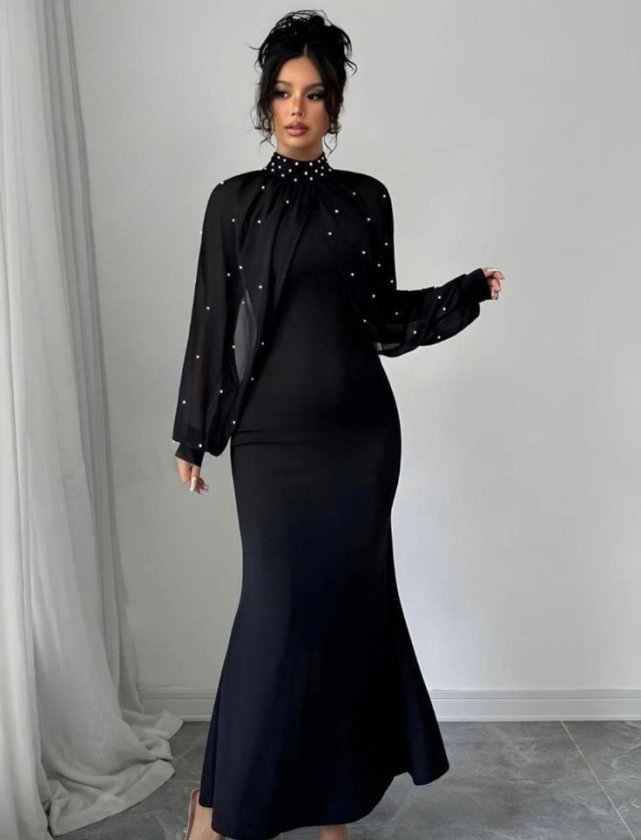 Kadın Balıkçı Yaka İnci Ve Tül Detay Dalgıç Kumaş Maxi Boy Elbise