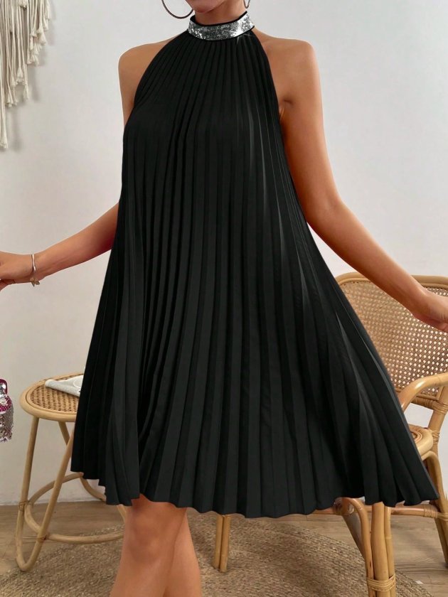 Kadın Balıkçı Yaka Omuzlardan Açık Pılelı Kısa Janjan Krep Elbise