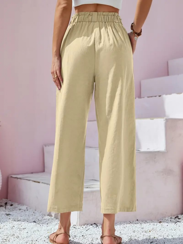 Kadın Bel Büzgü Ve Düğme Detay Kapri Keten Pantolon