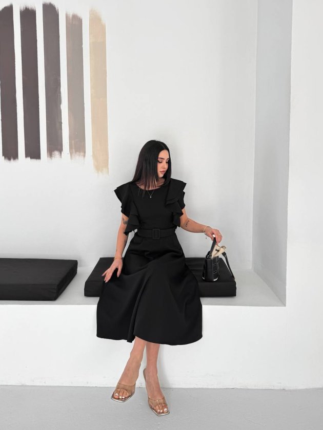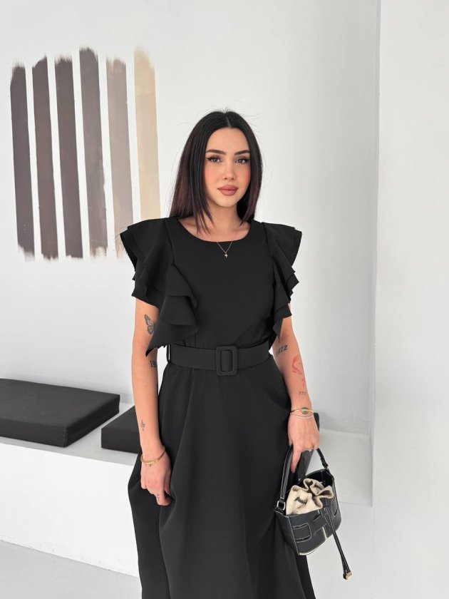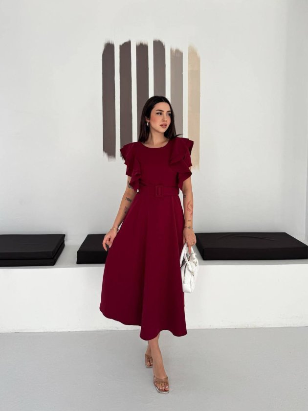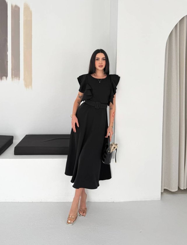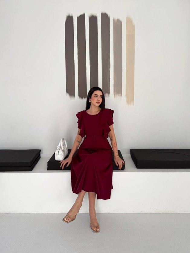 Kadın Bisiklet Yaka Kollar Fırfırlı Kemer Dahil Double Kumaş Midiboy Elbise