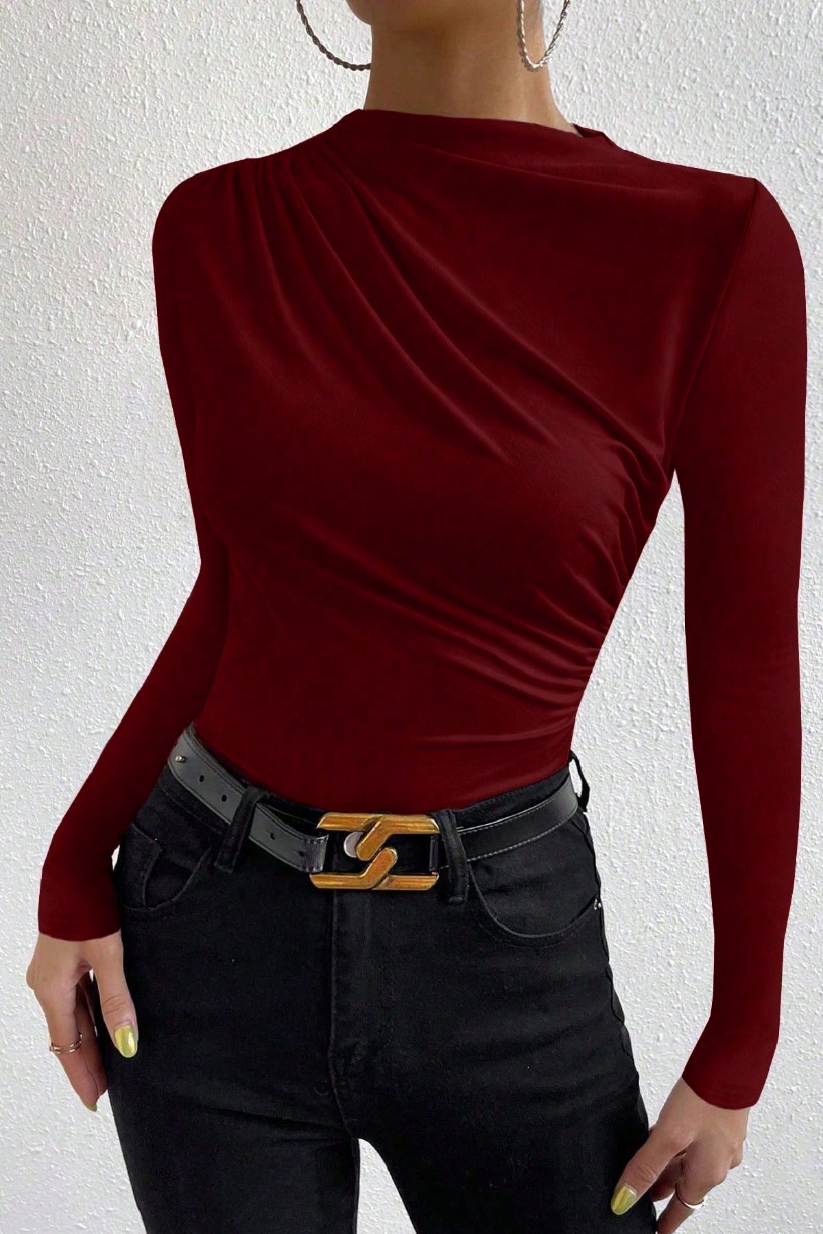 Kadın Bordo Belden ve Boyundan Büzgü Detaylı Uzun Kollu Bluz