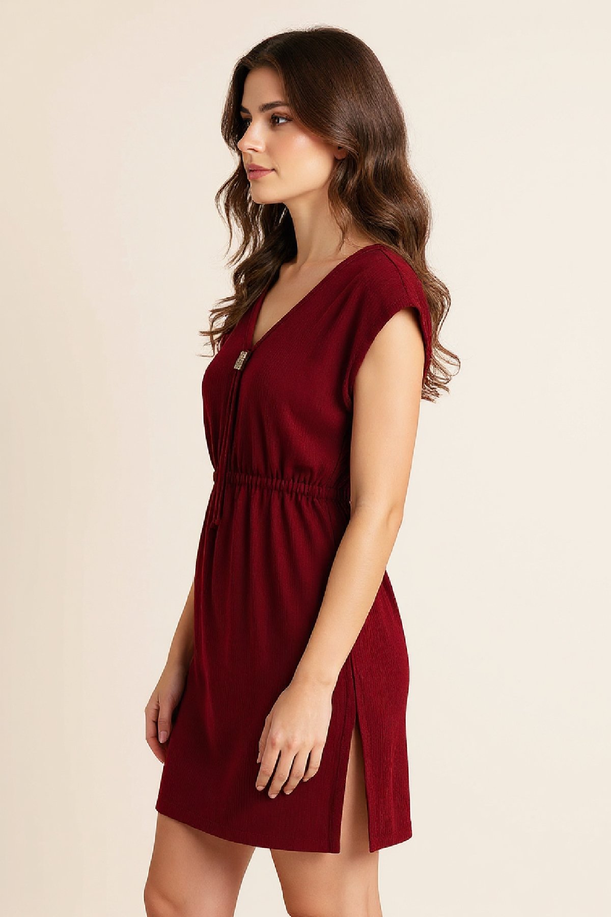 • Kadın Bordo Yanları Yırtmaçlı Tokalı V Yaka Mini Plaj Elbisesi, sezonun en çarpıcı tonlarından biriyle karşınızda.