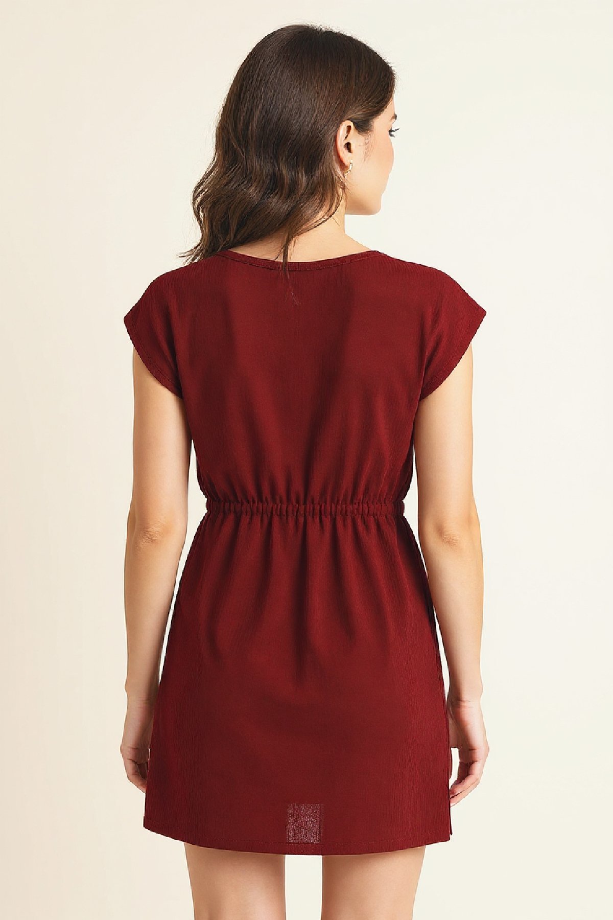 Kadın Bordo Yanları Yırtmaçlı Tokalı V Yaka Mini Plaj Elbisesi