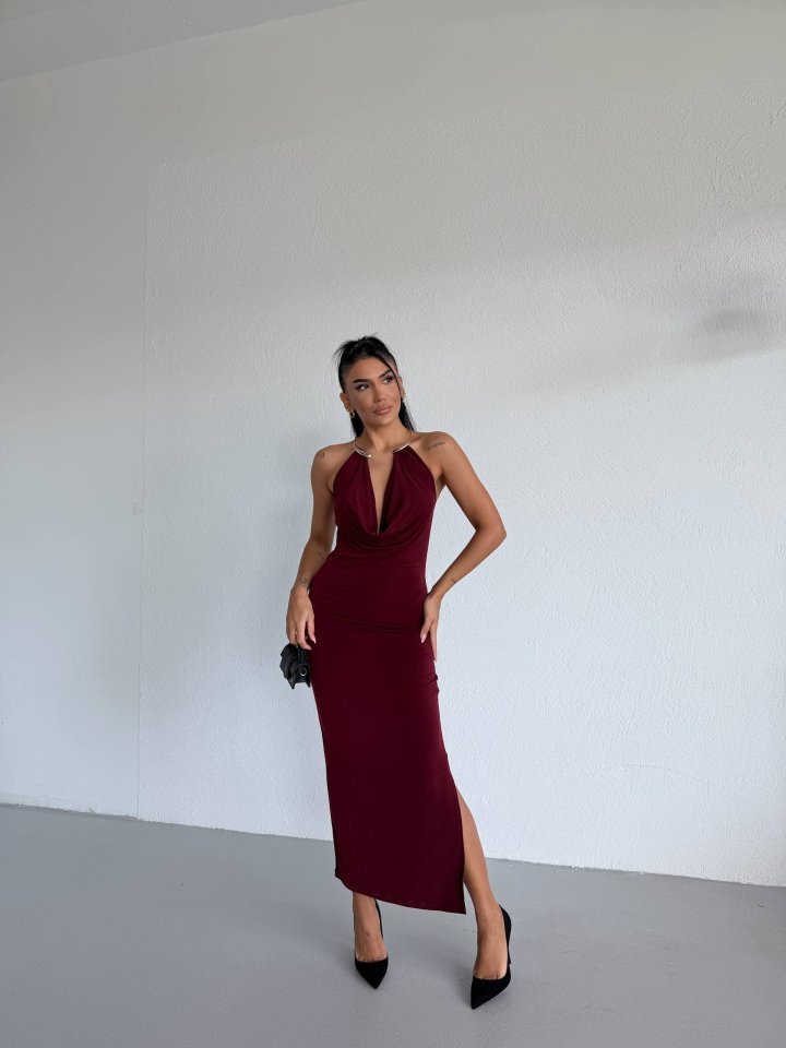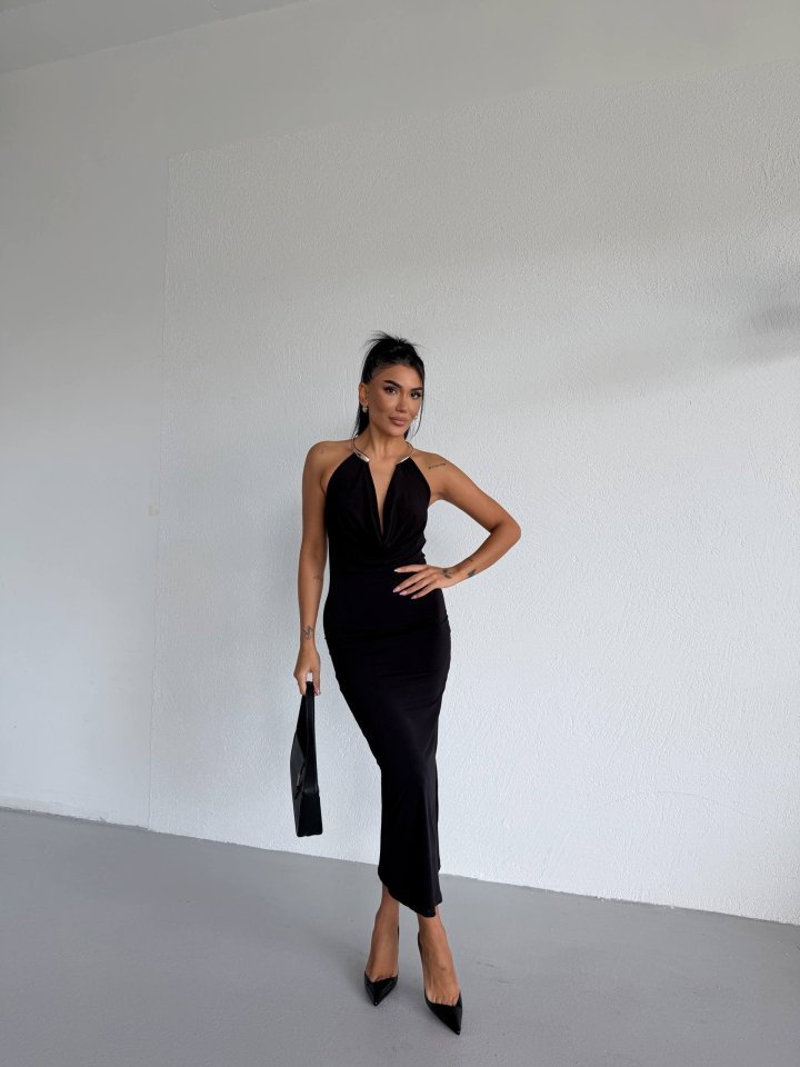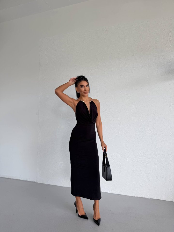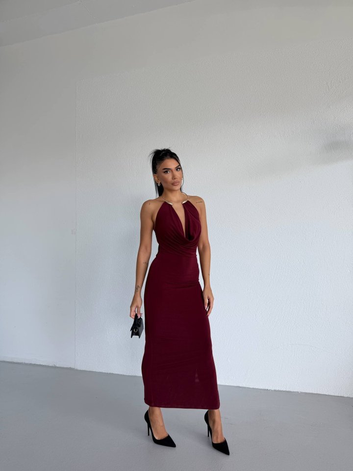 Kadın Boyun Aksesuarlı Halter Yaka Maxi Boy Sandy Kumaş Elbise