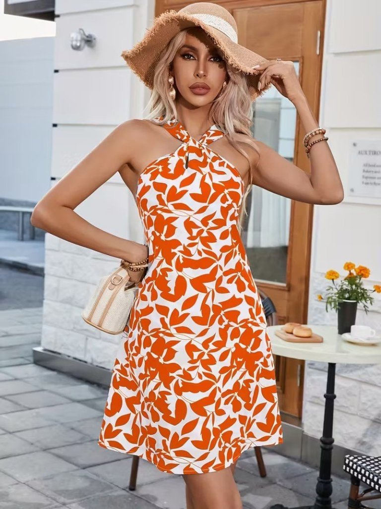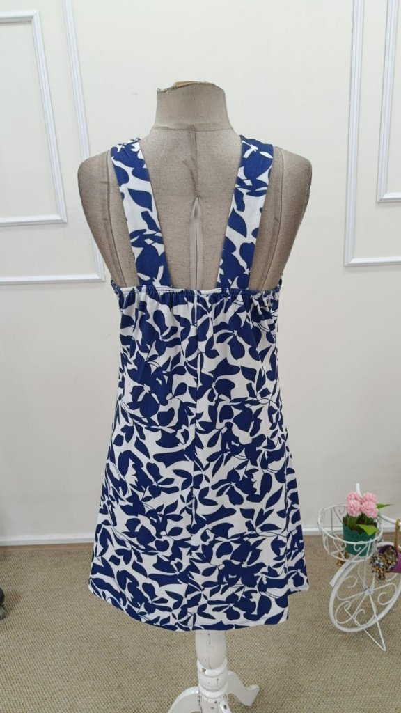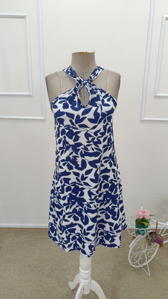 Kadın Boyundan çapraz Askı Damla Detaylı Omuzlardan Açık Desenli Kısa Süprem Elbise