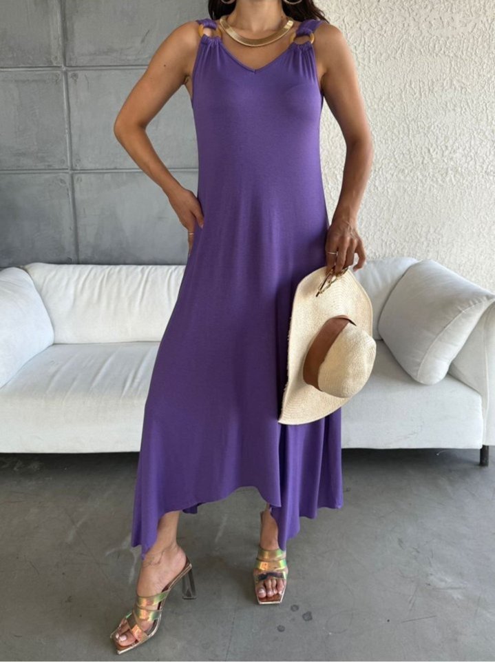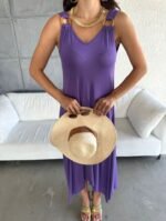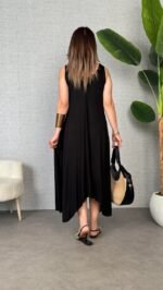 Kadın Askılı Geometrik Yakalı Geniş Kesim Detaylı Ithal Krep Elbise