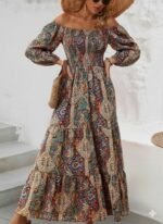Kadın Düşük Omuzlu Beli Büzgülü Dijital Desenli Kesik Elyaf Süprem Uzun Elbise