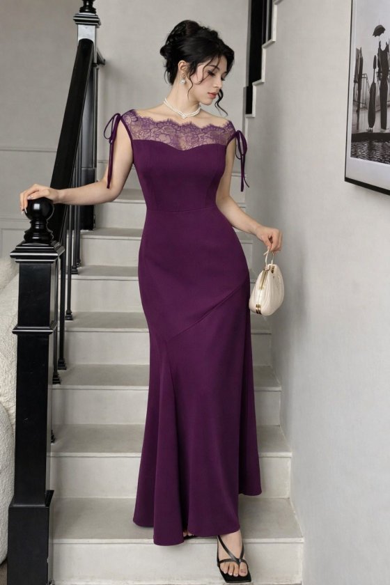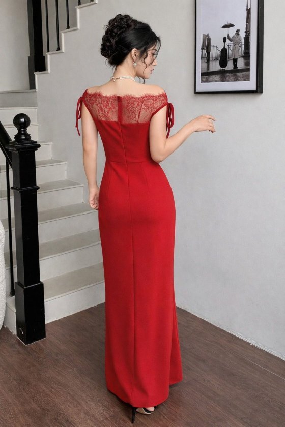 Kadın Göğüs Ve Yakası Dantel Detaylı Kayık Yaka Görünümlü Uzun Ithal Krep Elbise