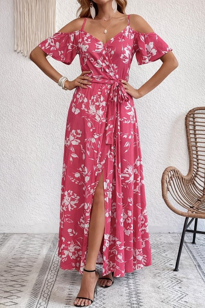 Kadın Ip Askılı Kısa Kollu Kruvaze Yakalı Yırtmaçlı Desenli Süprem Elbise