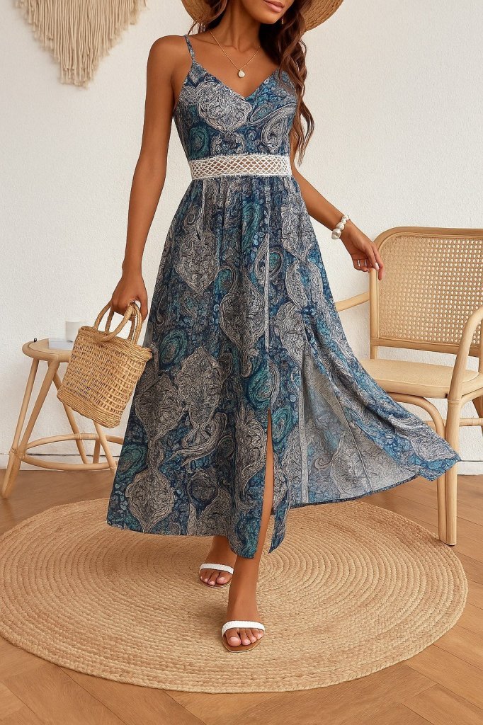 Kadın Ip Askılı V Yakalı Bel Güpür çiçek Desenli Yandan Yırtmaçlı Maksi Süprem Elbise