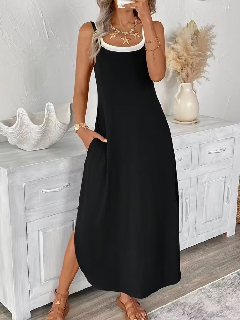 Kadın Ip Askılı Yuvarlak Yakalı Cepli Uzun Viskon Elbise