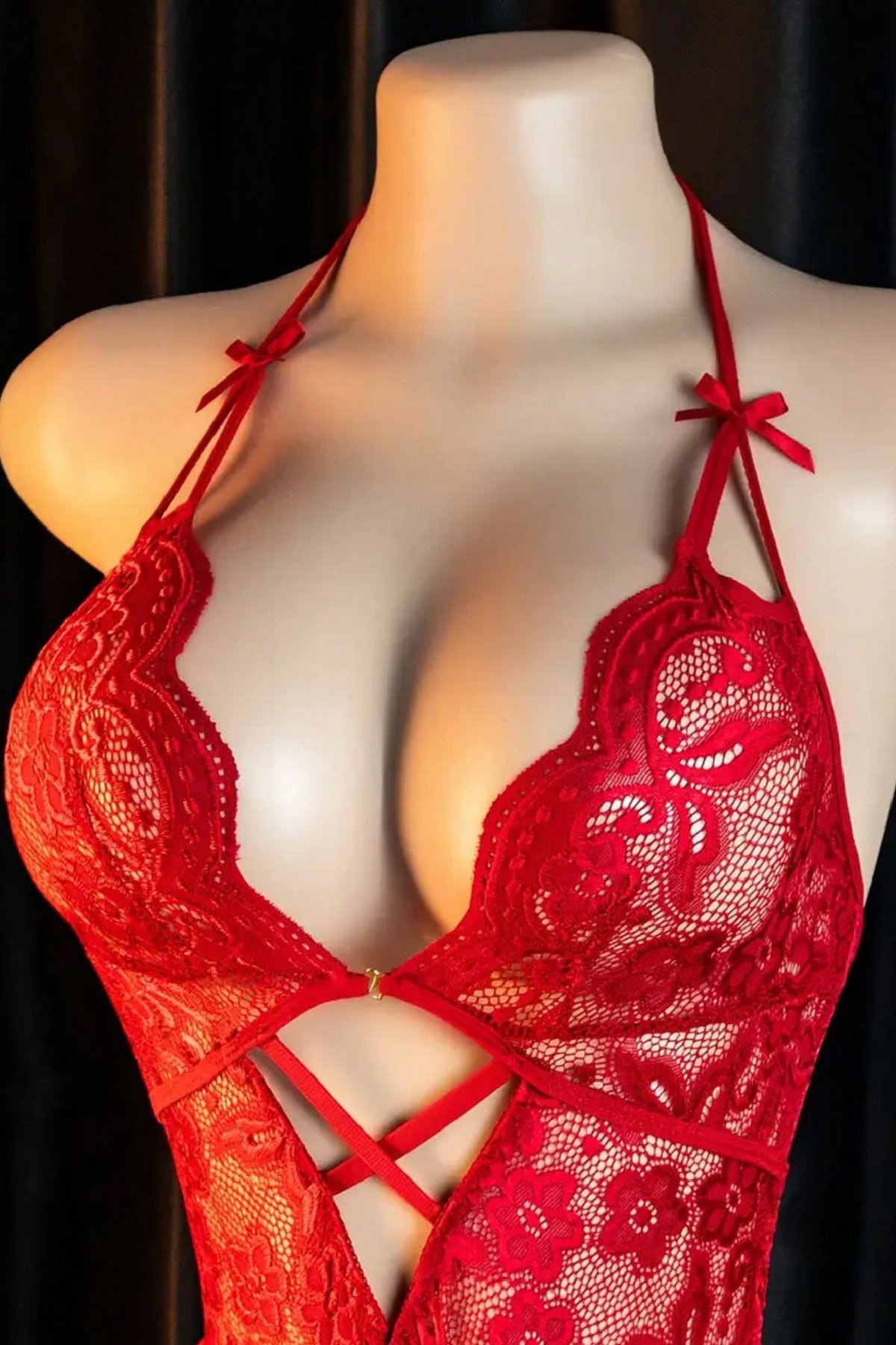 Kadın Kırmızı Dantel ve Tül Detaylı Derin V Yaka Teddy Gecelik