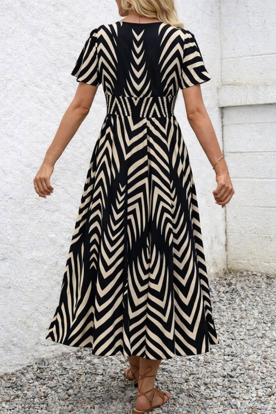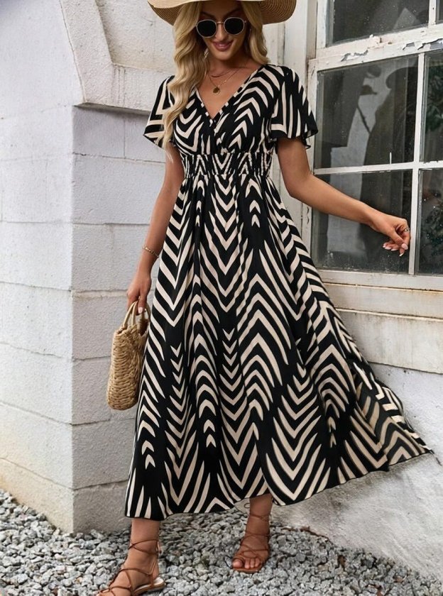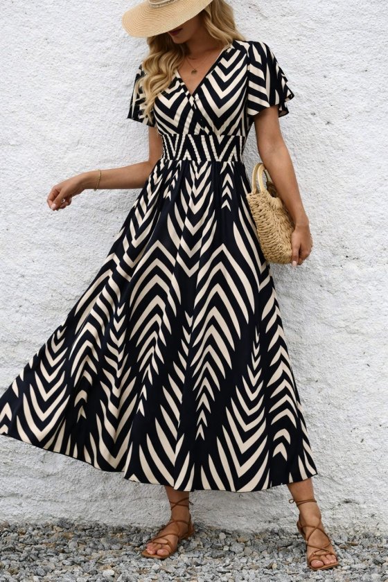 Kadın Kısa Fırfır Kollu Kruvaze Yakalı Beli Lastikli Desenli Uzun Elbise