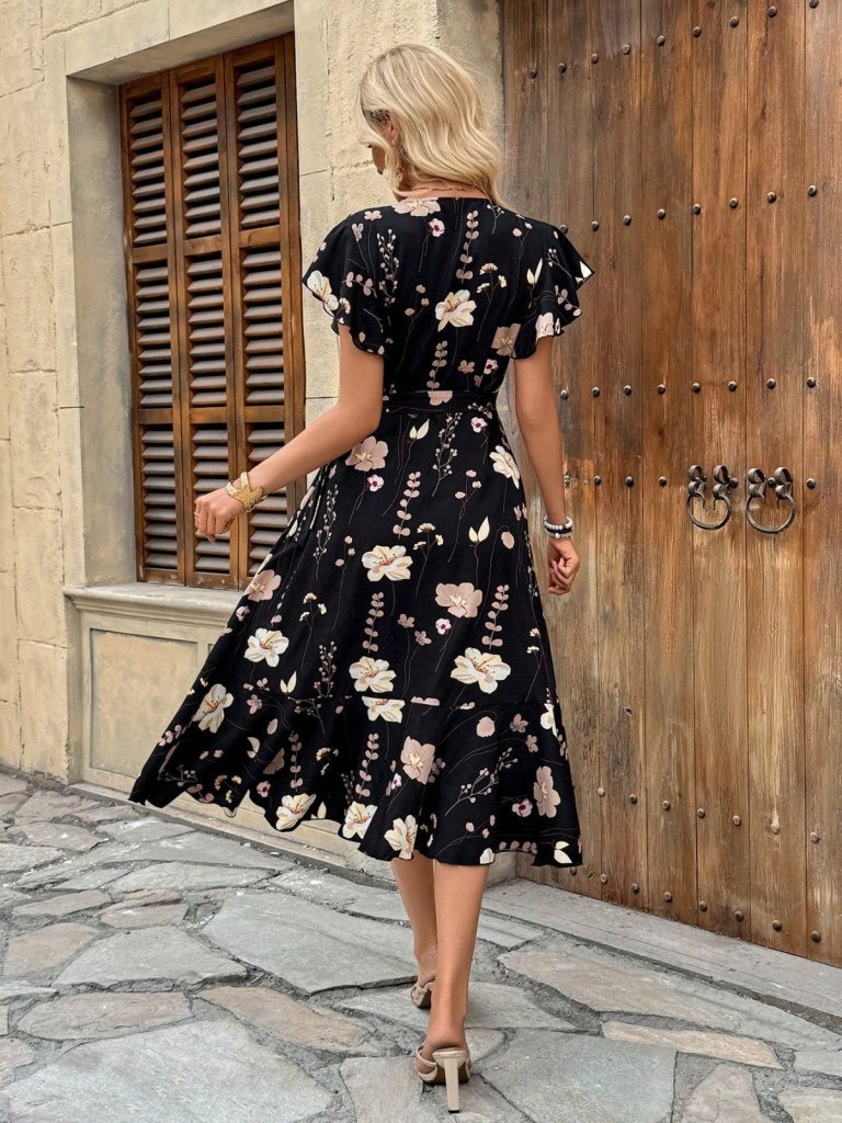 Kadın Kısa Kelebek Kollu Kruvaze Yakalı Belden Kuşaklı Midi Süprem Elbise