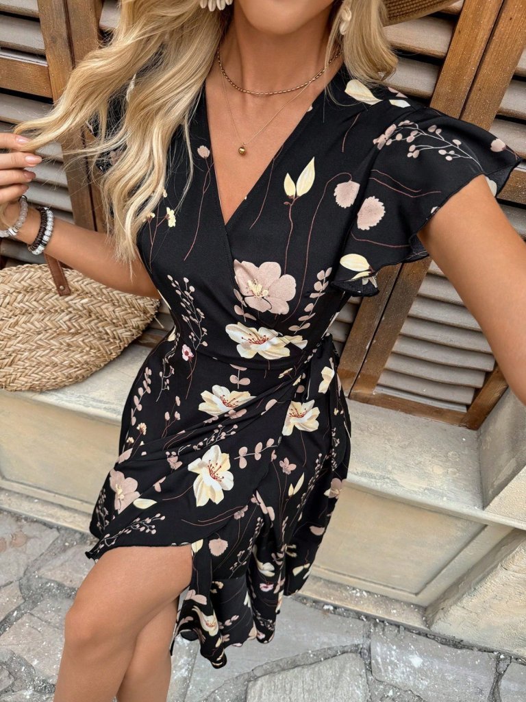 Kadın Kısa Kollu Kruvaze Yaka Eteği Volanlı Krep Elbise