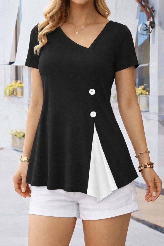 Kadın Kısa Kollu Asimetrik V Yakalı Düğme Detaylı Viskon Bluz