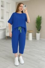 Kadın Kısa Kollu Bisiklet Yaka Viskon Iki Iplik Bluz Ve Pantolon Ikili Takım