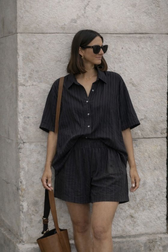 Kadın Kısa Kollu çizgili Modal Kumaş Gömlek Ve Yüksek Bel Lastik Detay şort Ikili Takım