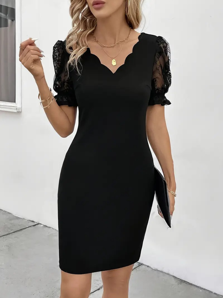 Kadın Kısa Kollu Dantelli V Yakalı Yanlardan Büzgülü çapraz Detaylı Ithal Krep Elbise
