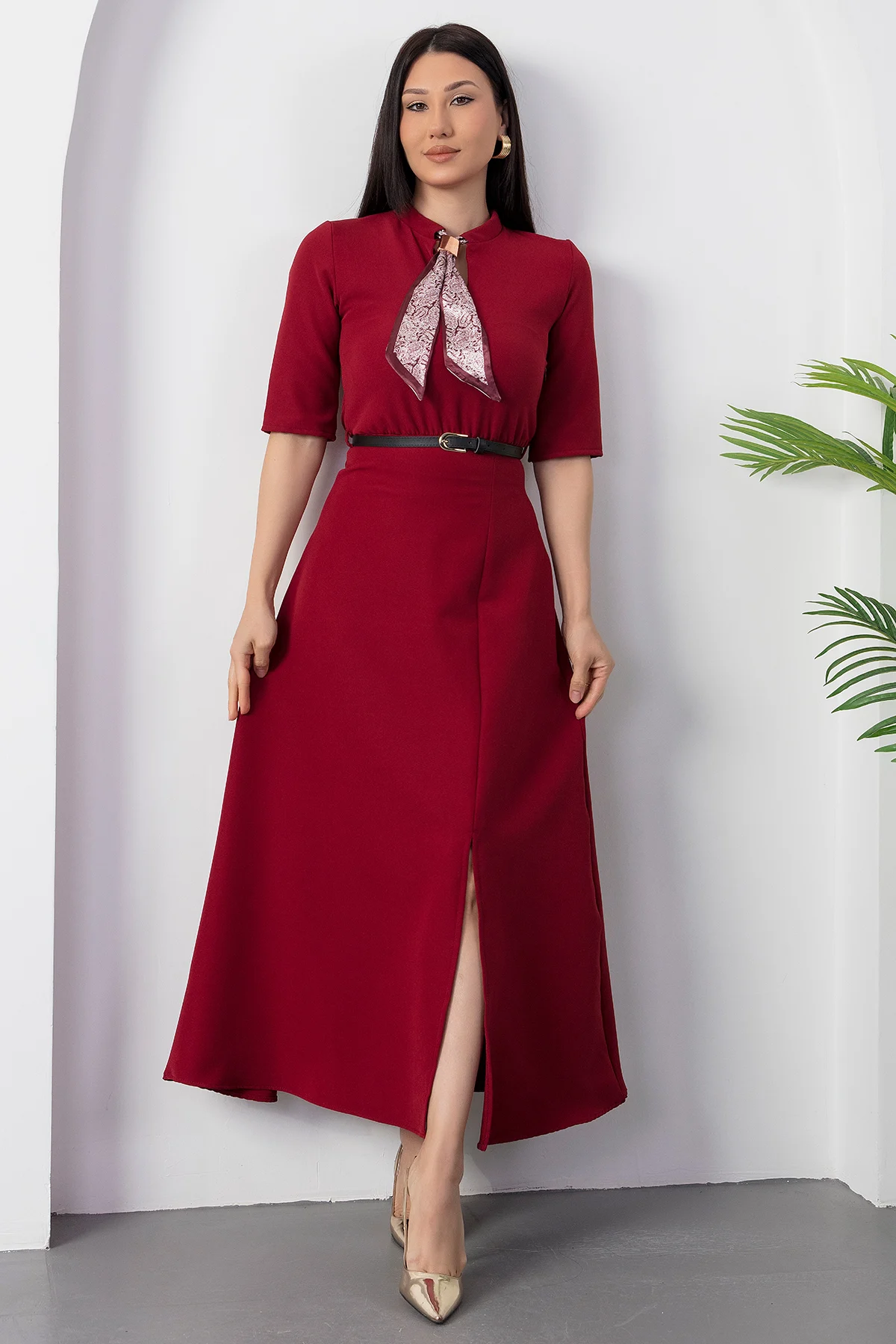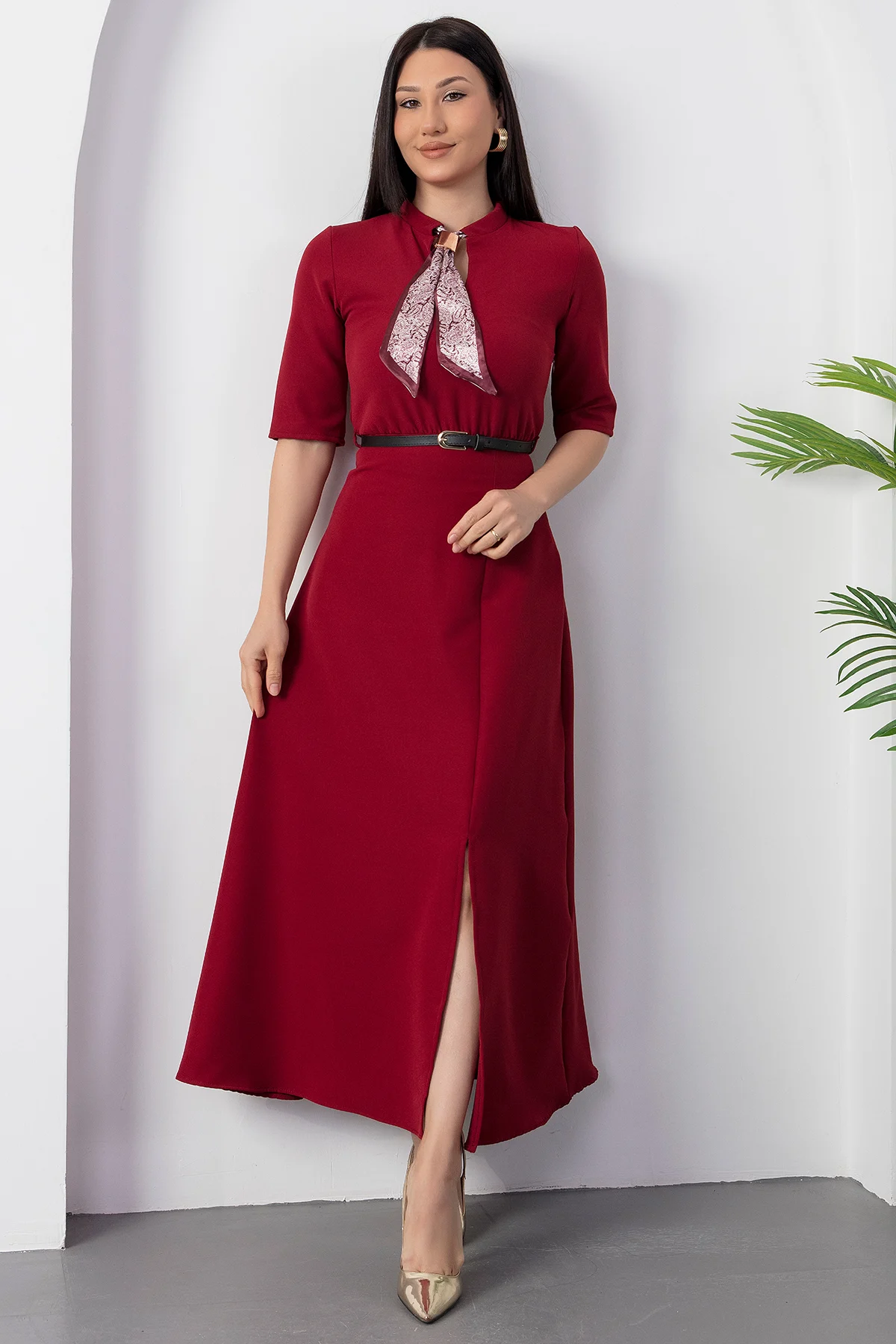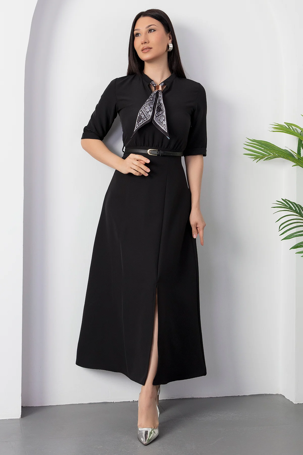 Kadın Kısa Kollu Fular Ve Kemer Detay önden Yırtmaçlı Maxi Boy Elbise