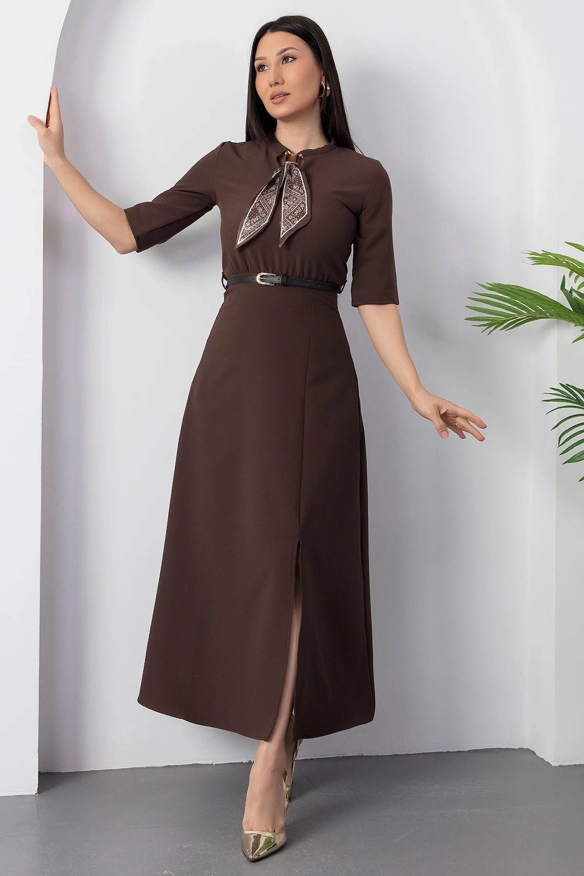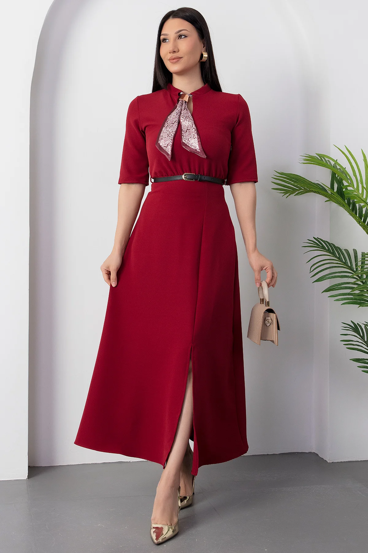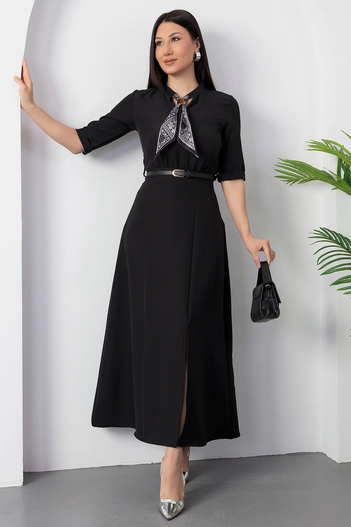 Kadın Kısa Kollu Fular Ve Kemer Detay önden Yırtmaçlı Maxi Boy Elbise