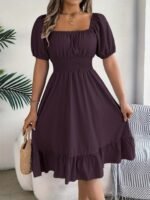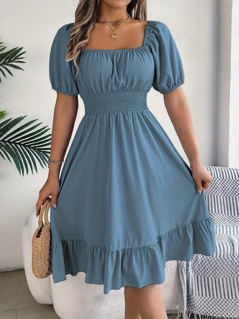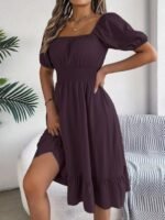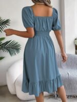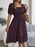 Kadın Kısa Kollu Kare Yakalı Beli Lastikli Kısa Trikoton Elbise