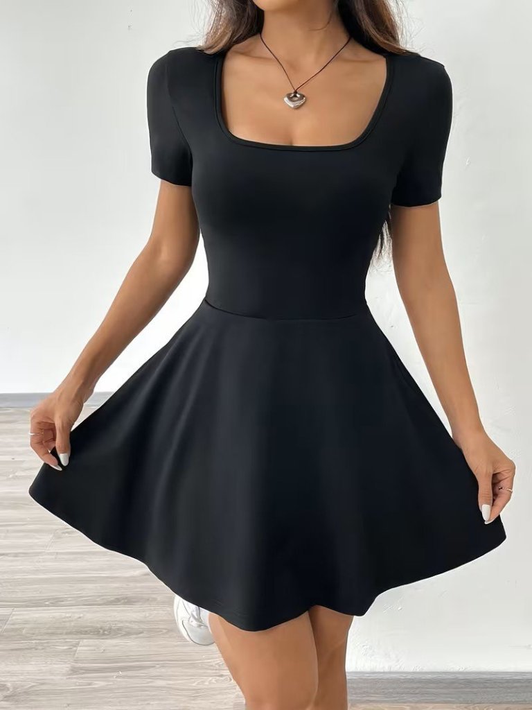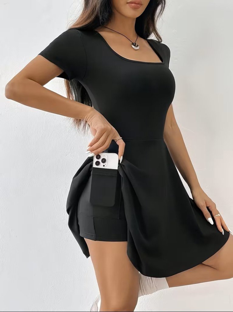 Kadın Kısa Kollu Kare Yakalı Cep Detaylı Dalgıç Elbise Tulum