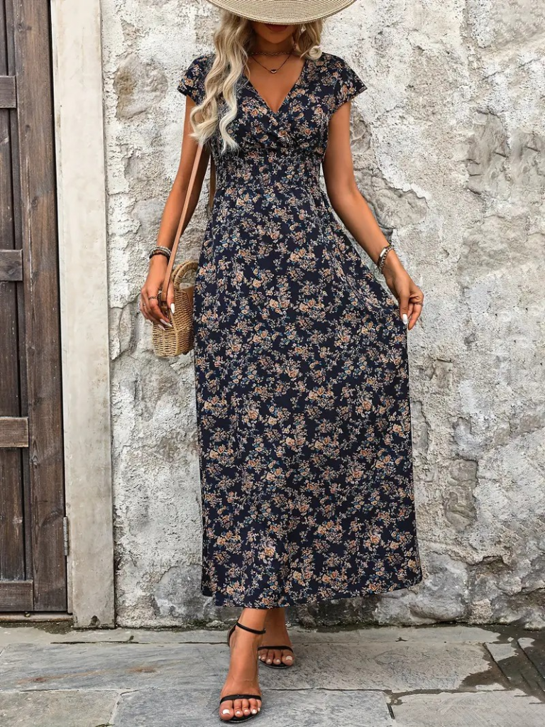 Kadın Kısa Kollu Kruvaze Yakalı çiçek Desenli Belden Lastikli Süprem Uzun Elbise