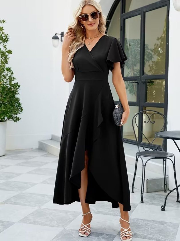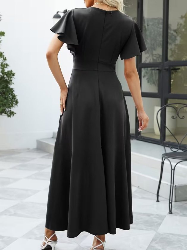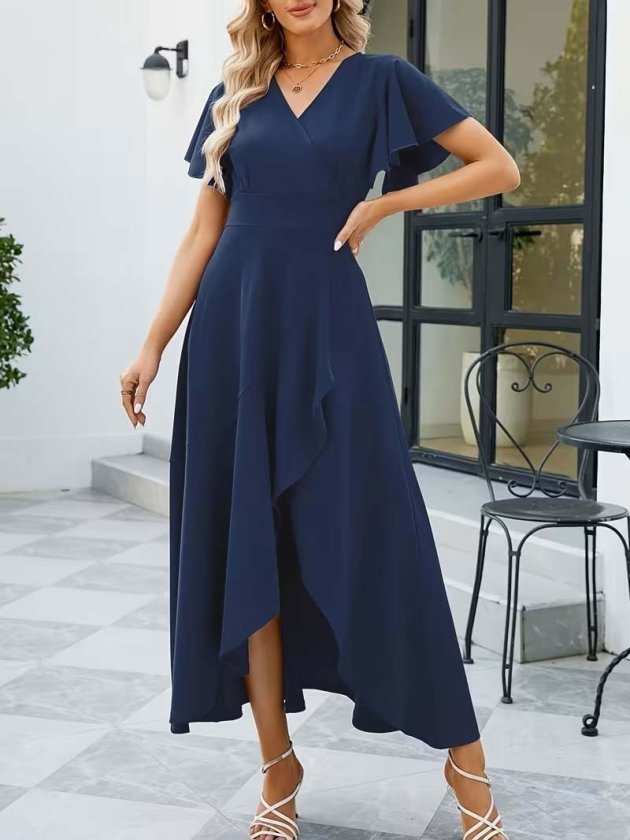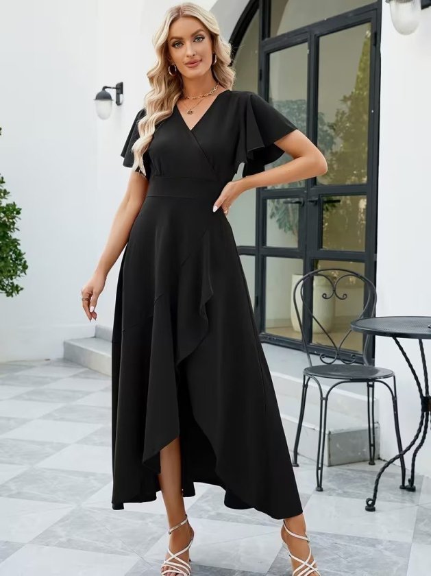 Kadın Kısa Kollu Kruvaze Yakalı ön Asimetrik Volanlı Uzun Ithal Krep Elbise