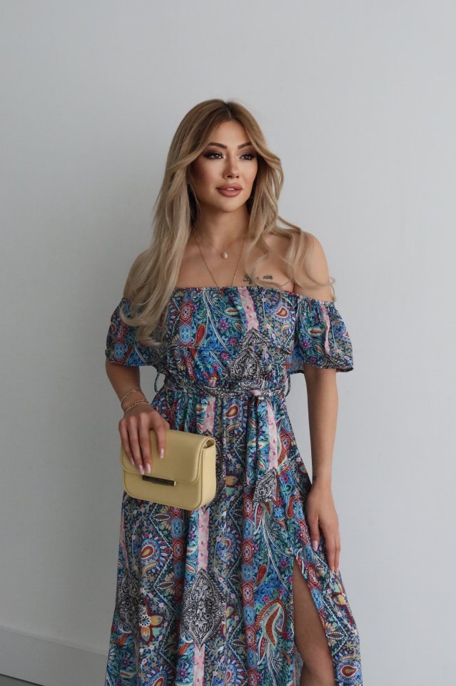 Kadın Kısa Kollu Madonna Yaka Fırfırlı Belden Yırtmaçlı Maksi Süprem Elbise