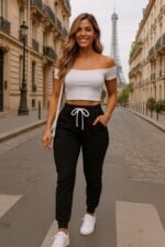 Kadın Kısa Kollu Madonna Yaka Viskon Crop Bluz Cepli Iki Iplik Eşofman Takım