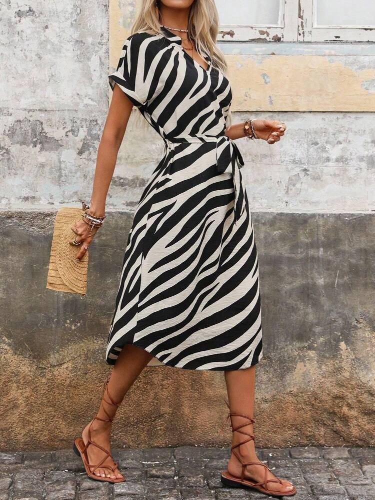 Kadın Kısa Kollu V Hakim Yakalı Zebra Desenli Midi Süprem Elbise