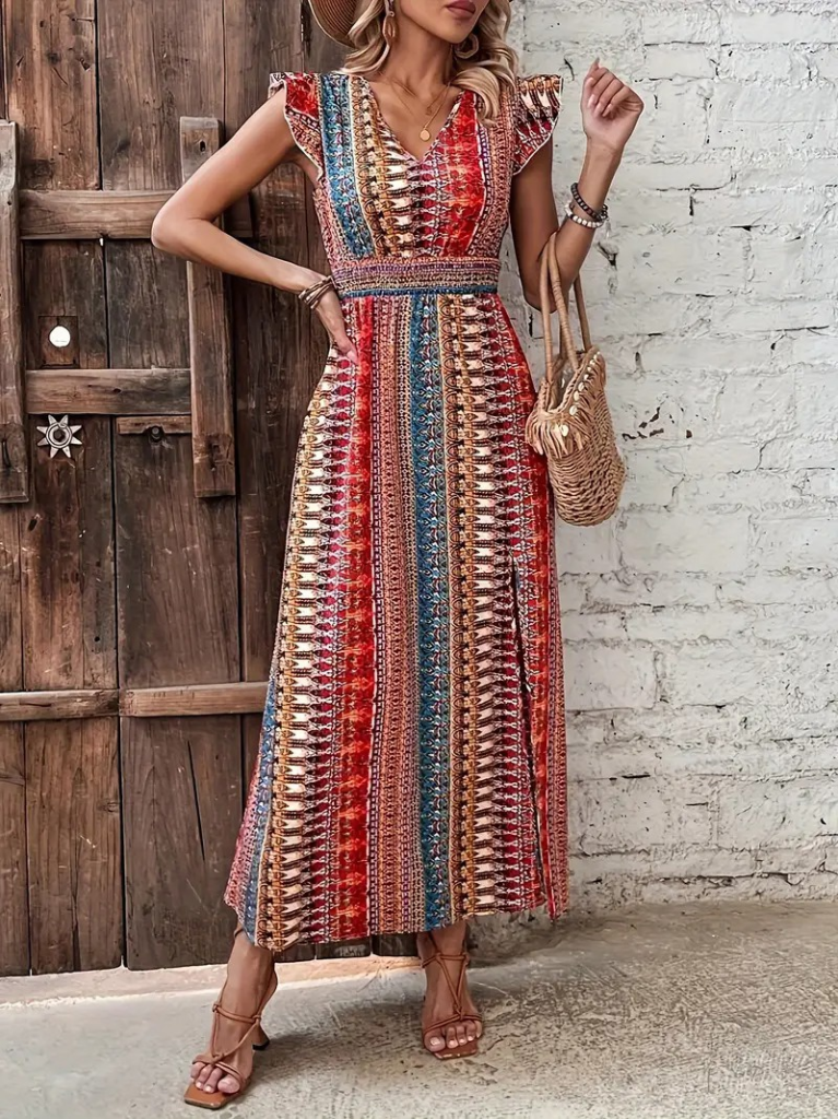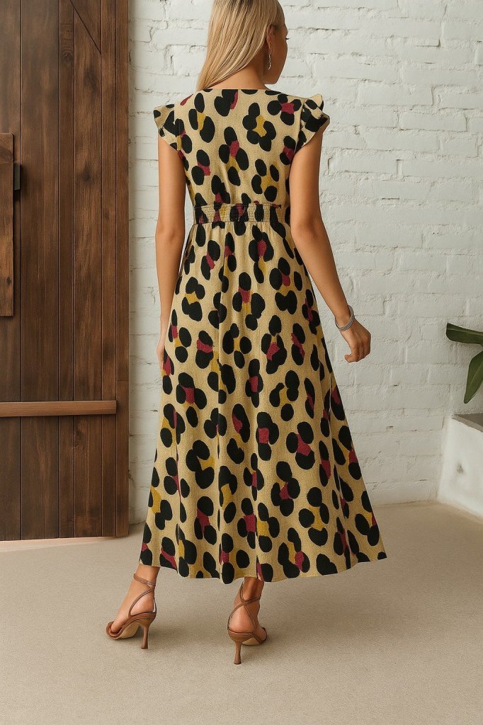 Kadın Kısa Kollu V Yakalı Desenli Yandan Yırtmaçlı Süprem Elbise