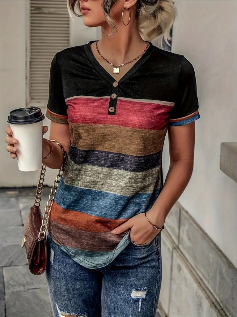 Kadın Kısa Kollu V Yakalı Düğmeli çok Renkli Süprem Bluz