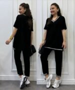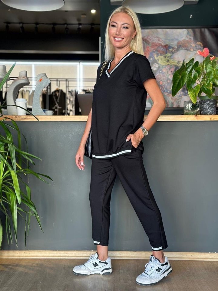 Kadın Kısa Kollu V Yakalı Iki Iplik Bluz Ve Pantolon Ikili Takım