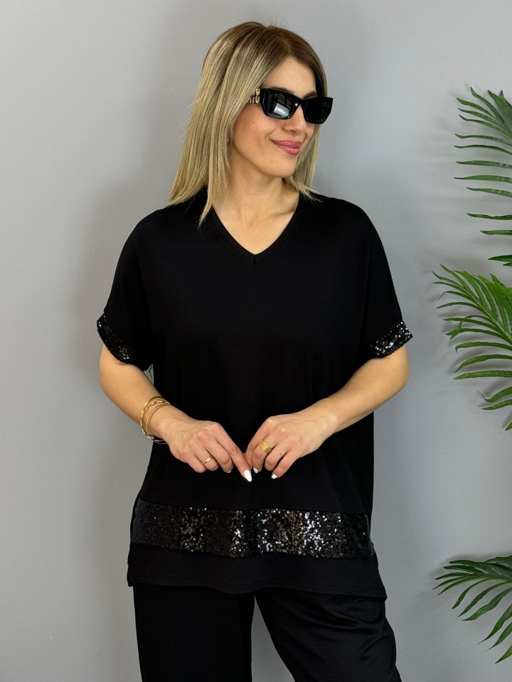Kadın Kısa Kollu V Yakalı Pul Payetli Viskon Iki Iplik Bluz Ve Pantolon Ikili Takım