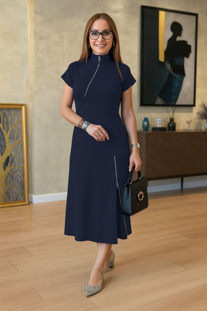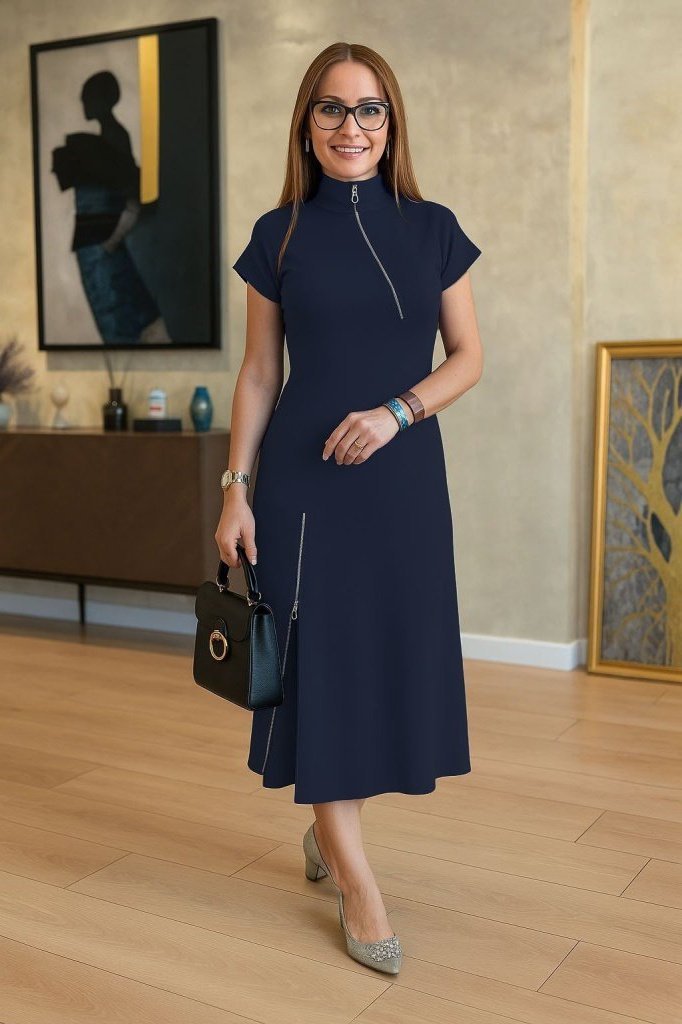 Kadın Kısa Kollu Yakadan Ve Etekten Fermuarlı Midi Viskon Iki Iplik Elbise