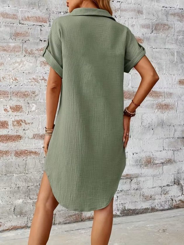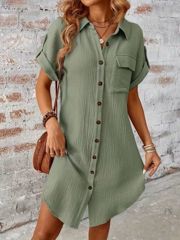 Kadın Kısa Kollu Yakalı önden Düğmeli Bürümcük Kısa Elbise